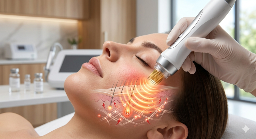 Połączenie mikronakłuwania z energią RF pobudza fibroblasty do intensywnej produkcji kolagenu i elastyny oraz uruchamia procesy przebudowy skóry. Dzięki temu dochodzi do stopniowej poprawy jej napięcia, gęstości oraz struktury.